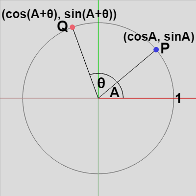 例えば半径 $1$ の円周上において、$(1, 0)$ から角度 $A$ 離れた位置にある点を $P$ とすれば、$P = (\cos A,\ \sin A)$ であるが、$P$ を角度 $\theta$ 回転させた位置を $Q$ とすれば、その位置は $Q = (\cos(A + \theta),\ \sin(A + \theta))$ となる。