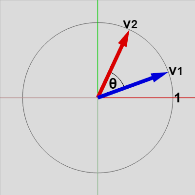 図21 単位ベクトル $\boldsymbol{\mathsf{v_1}} = (a_1, b_1)$、$\boldsymbol{\mathsf{v_2}} = (a_2, b_2)$ 1-1節で見たようにベクトル $\boldsymbol{\mathsf{v_1}} = (a_1, b_1)$ と $\boldsymbol{\mathsf{v_2}} = (a_2, b_2)$ の内積は\[\boldsymbol{\mathsf{v_1}} \cdot \boldsymbol{\mathsf{v_2}} = a_1a_2 + b_1b_2\]として定義される。また $\boldsymbol{\mathsf{v}_1}$ と $\boldsymbol{\mathsf{v}_2}$ のなす角を $\theta$ とするとき、内積は $\cos\theta$ を用いて\[\boldsymbol{\mathsf{v_1}} \cdot \boldsymbol{\mathsf{v_2}} = |\boldsymbol{\mathsf{v}_1}||\boldsymbol{\mathsf{v}_2}|\cos\theta\]とも表される。$\boldsymbol{\mathsf{v}_1}$、$\boldsymbol{\mathsf{v}_2}$ がいずれも単位ベクトルであるとき、$\boldsymbol{\mathsf{v_1}} \cdot \boldsymbol{\mathsf{v_2}} = |\boldsymbol{\mathsf{v}_1}||\boldsymbol{\mathsf{v}_2}|\cos\theta\ = \cos\theta$ であるから、この場合には以下の等式が成り立つ。