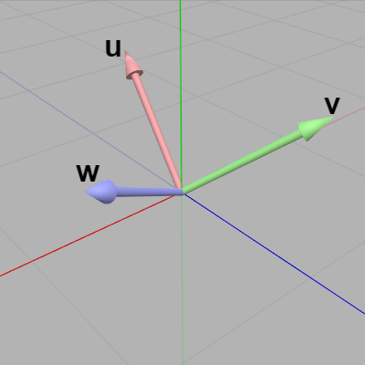 まず緯度、経度を変化させて向きを $\boldsymbol{\mathsf{w}}$ に一致させる (下図34)。次にロール角度を変化させて上方向を $\boldsymbol{\mathsf{v}}$ に一致させる (図35 ; ロール回転の回転軸は $\boldsymbol{\mathsf{w}}$ であり、ロール回転によって $\boldsymbol{\mathsf{w}}$ は変化しない)。結果的に図35に示されるように3つのベクトルは $\boldsymbol{\mathsf{u}}$、$\boldsymbol{\mathsf{v}}$、$\boldsymbol{\mathsf{w}}$ と完全に一致することになる。