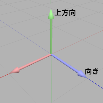 何も回転が行われていないとき、回転行列は単位行列(Identity Matrix)に等しいから、各ベクトルは下図33に示されるように x軸、y軸、z軸に重なっている。この回転が行われていない初期状態において青いベクトルを「向き」、緑のベクトルを「上方向」と定める。