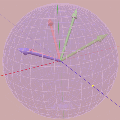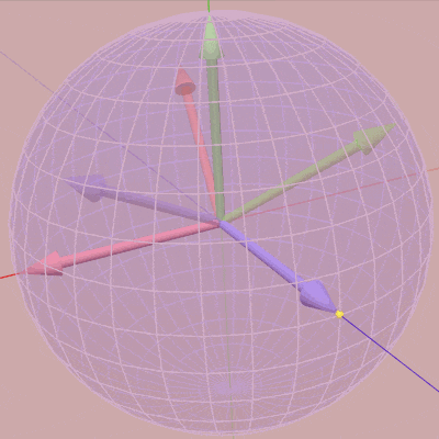 ローカル座標系の z軸、y軸、x軸の順で回転を行うものである。intrinsic rotations の Z-Y-Xオーダーでは z-角度が経度、y-角度が緯度、x-角度がロール角度としての役割を持つ (この例では y-角度の符号を反転したものが球面上の緯度に一致する)。ただし上でも注意したようにオブジェクトの初期状態を適切に定めなければこういったことは見えてこない。